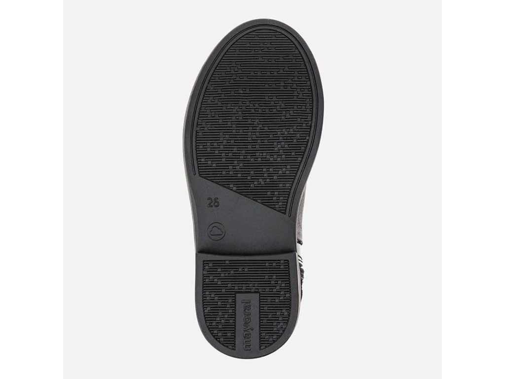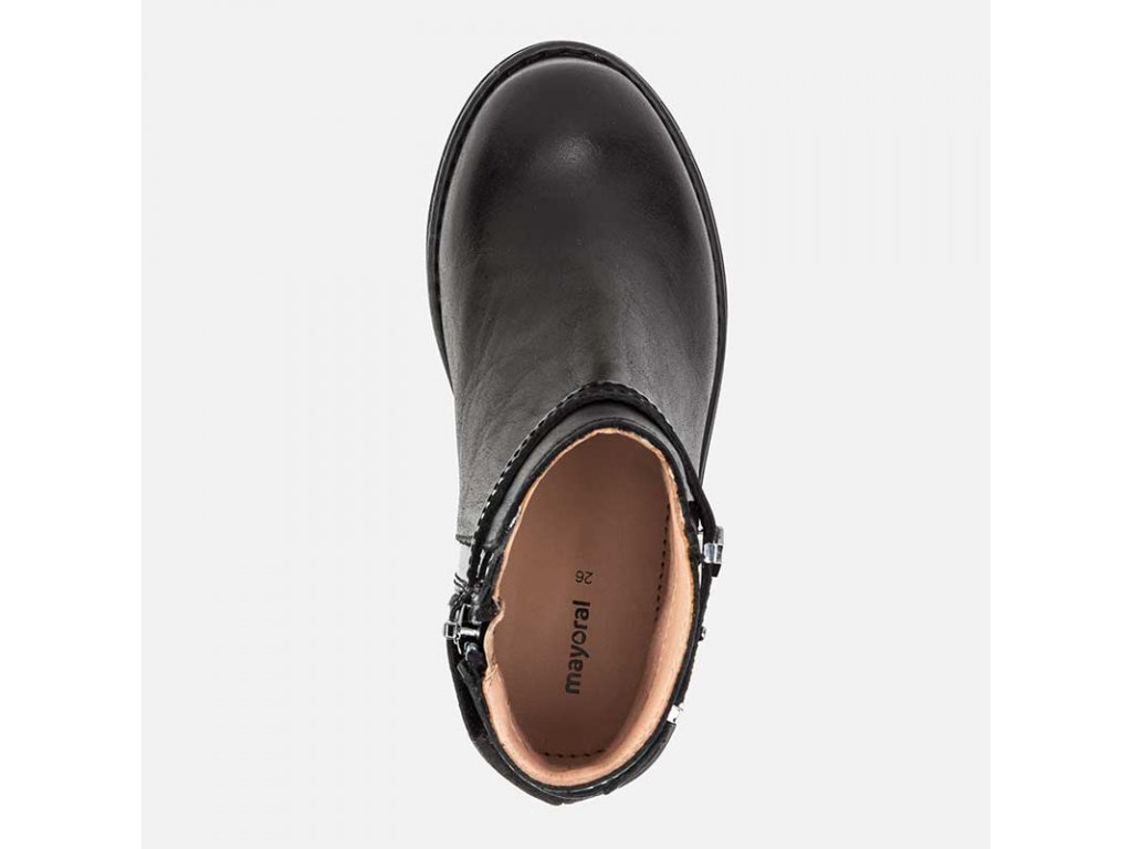 Kožené členkové čižmy od prémiovej španielskej značky Mayoral sú ideálne do chladnejších jesenných či jarných dní. Jednoduchý dizajn ozvláštňuje kovová pracka na boku. Čierna farebná kombinácia matného a lesklého materiálu sa ľahko kombinuje s rôznymi elegantnými outfitmi.