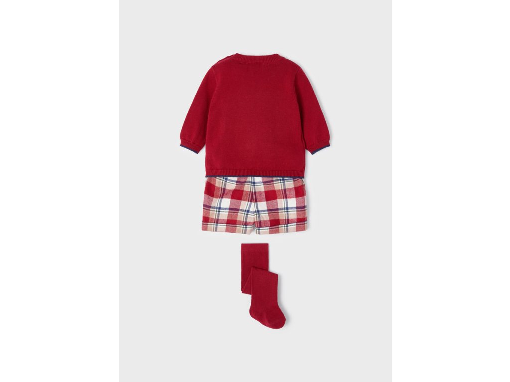 Vianočná súprava pre najmenších pozostávajúca z pleteného pulóvra, károvaných šortiek a pančušiek pre ten správny sviatočný outfit od prémiovej španielskej značky Mayoral.