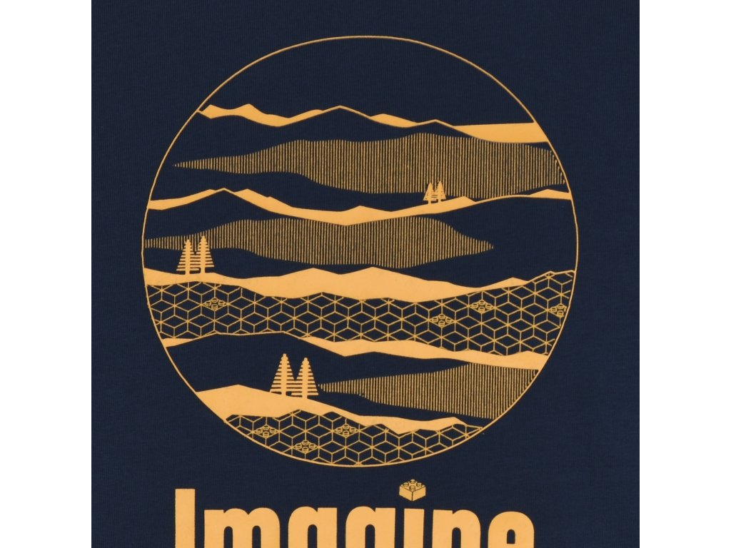 - vpredu matná potlač s 3D efektom (krajinka postavená z kociek LEGO so stromami a nápis "imagine")