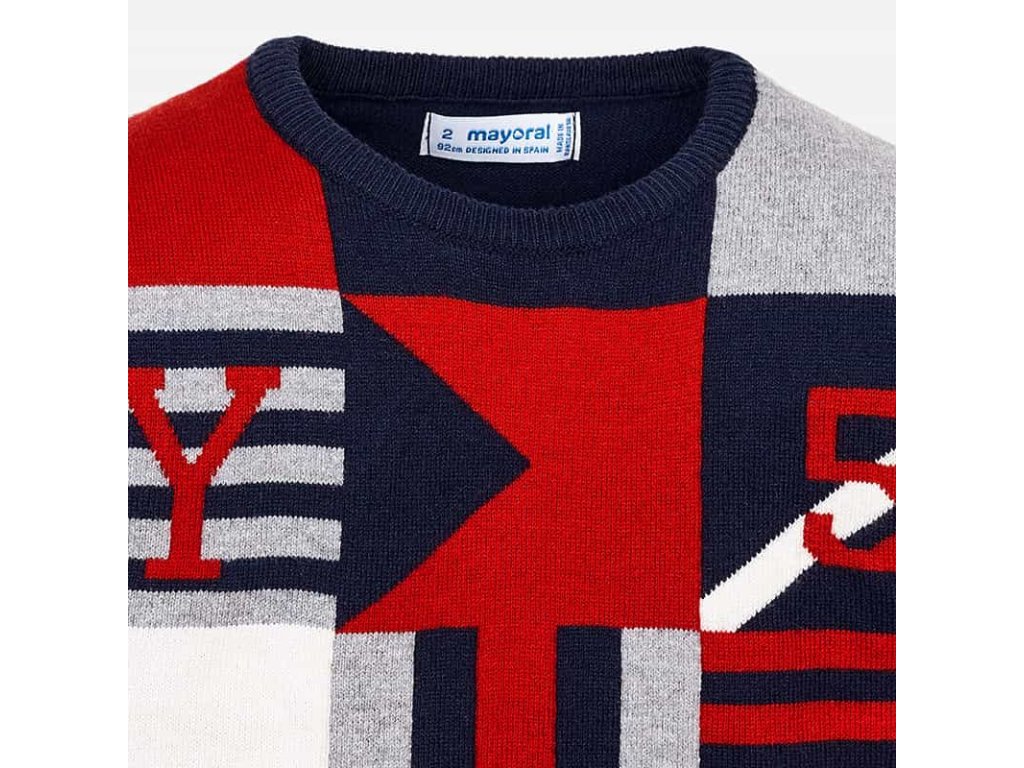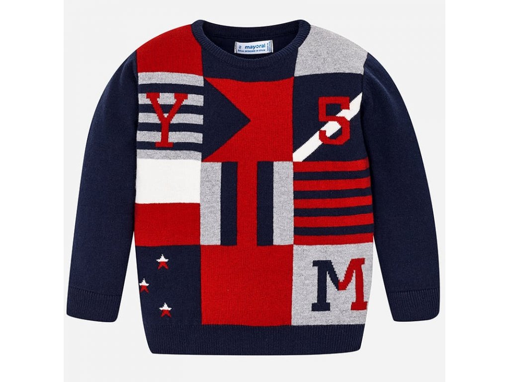 Štýlový pletený pulóver so štvorcovým vzorom od španielskej značky Mayoral je ideálnym doplnkom jesenného či zimného chlapčenského outfitu.