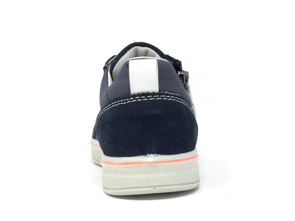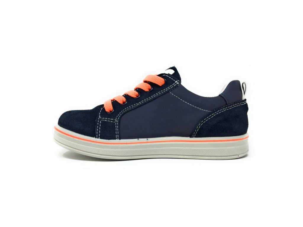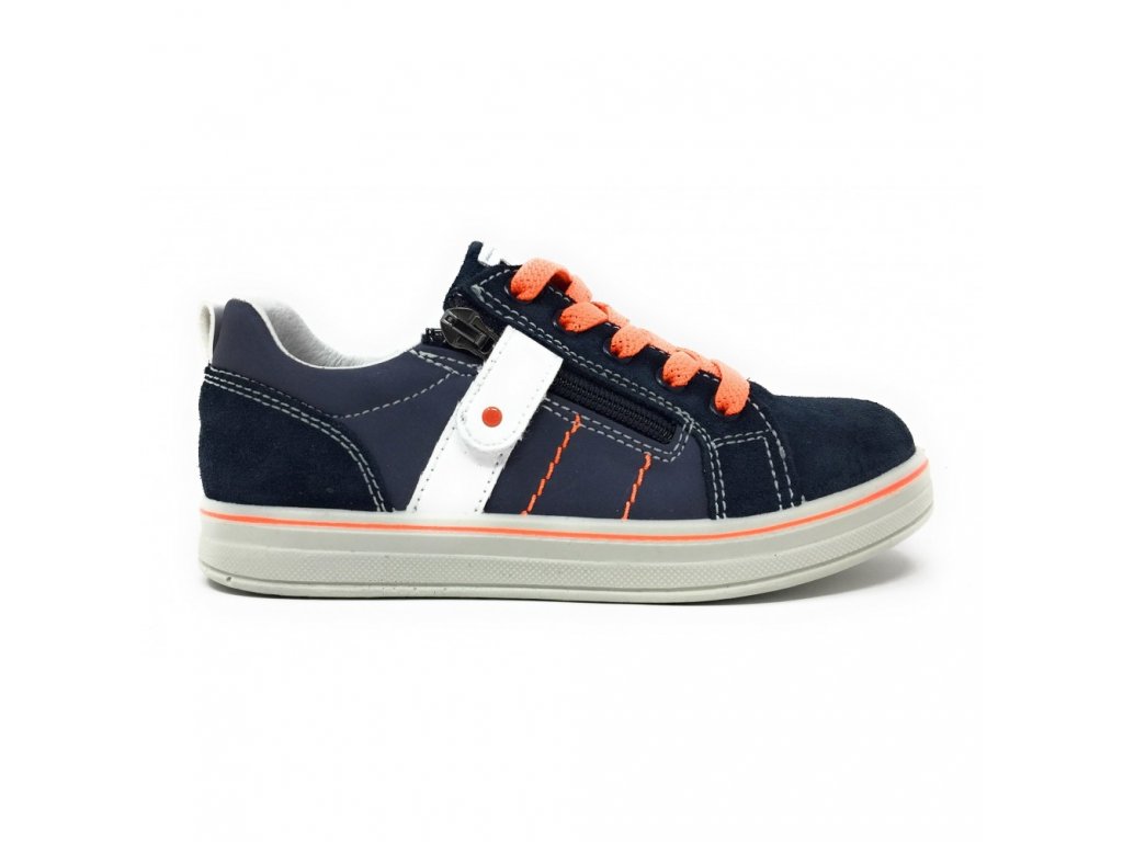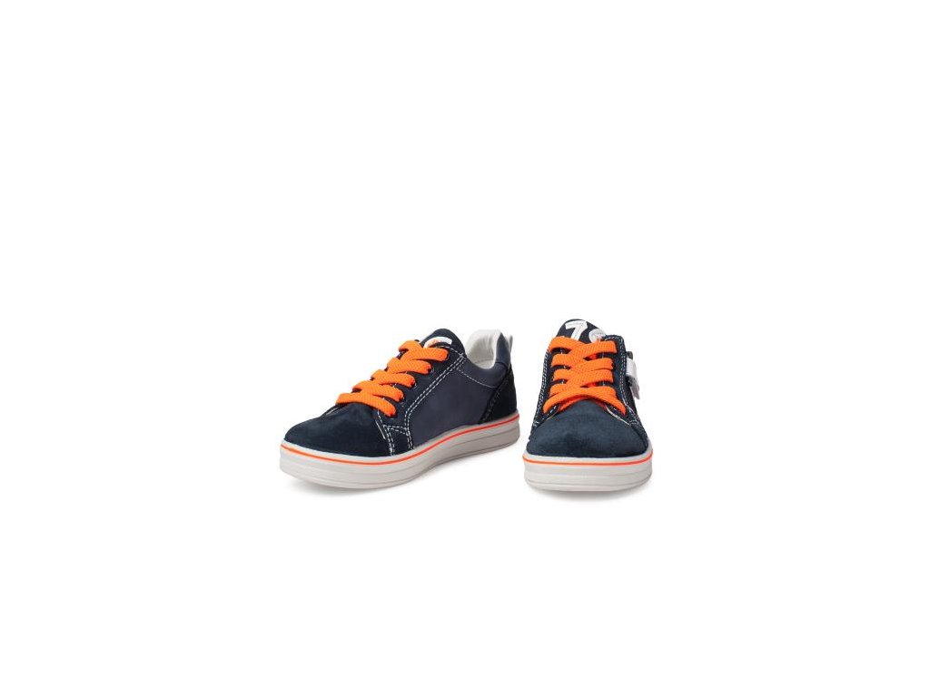 - Zapínanie: elastické šnúrky a bočný zips pre ľahšie obúvanie, navyše pár klasických tmavomodrých šnúrok na výmenu (elastické oranžové šnúrky je možné v prípade potreby odobrať a nahradiť klasickými šnúrkami na zaväzovanie)