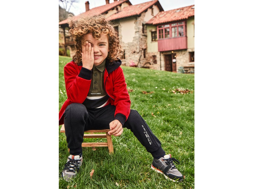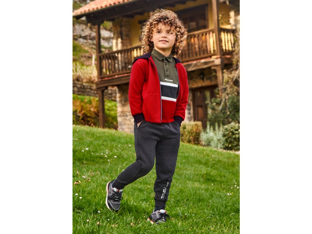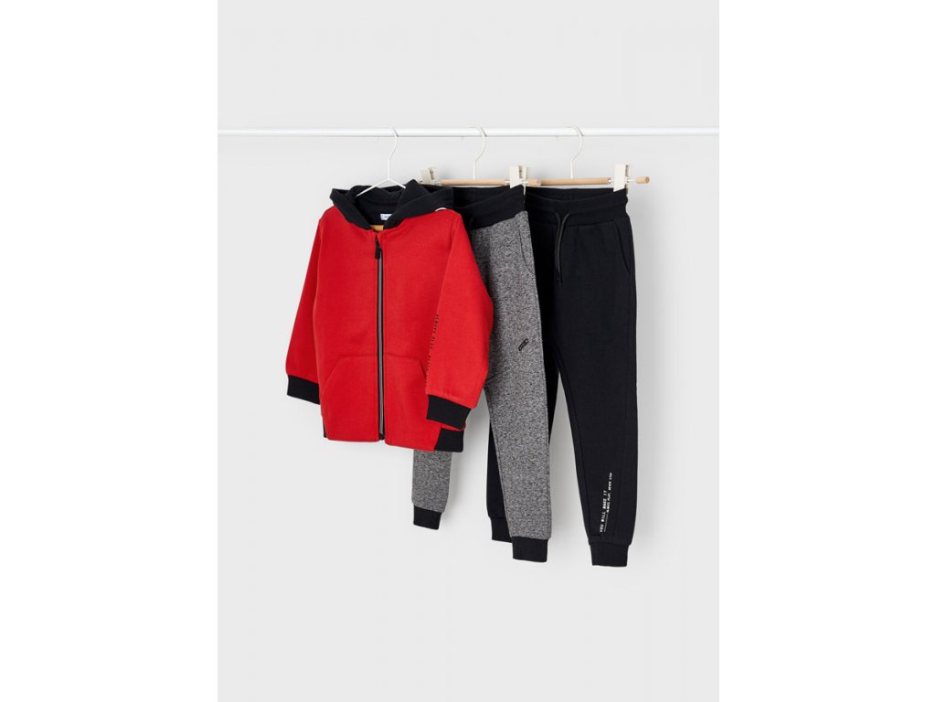 Štýlový trojdielny set: tepláková mikina so zipsom a dvoje tepláky so šnúrkami od prémiovej španielskej značky Mayoral.