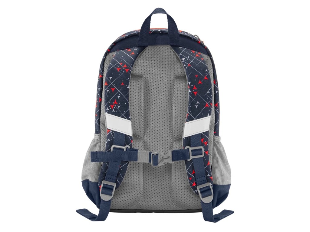 - 1 hlavná komora s dvojitým zipsom (do ruksaku sa zmestí 0,5 L fľaša, desiatový box a ďalšie potrebné veci, vo vnútri sklápacia priehradka na fľašu s nápojom a oddelená priehradka na zošity alebo časopisy)