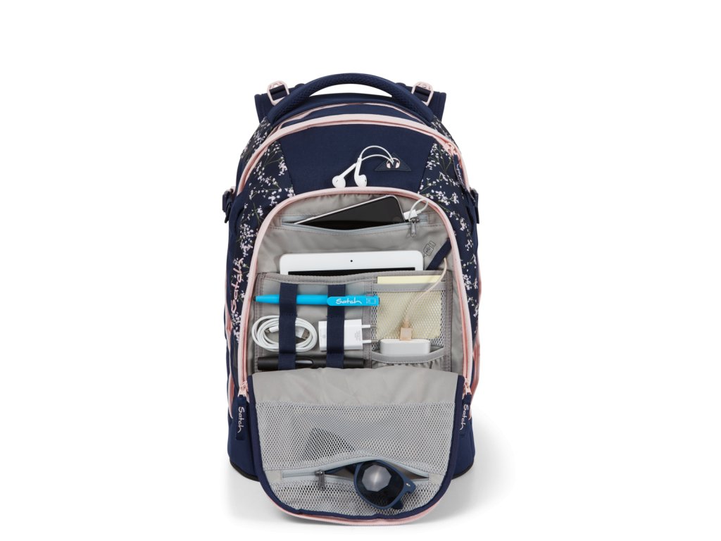 Model Satch Pack je ruksak so štandardnou veľkosťou úložného priestoru, ktorý vyhovuje väčšine študentov. Má jednu veľkú komoru, jednu menšiu komoru a predný organizér.
